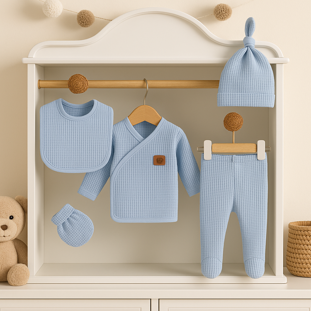 Das 5-teilige Body-Set aus Baumwollwaffelstoff wurde speziell für die empfindliche Haut von Neugeborenen entwickelt und bietet dank seiner atmungsaktiven Textur und der natürlichen Baumwollstruktur ganztägigen Tragekomfort.