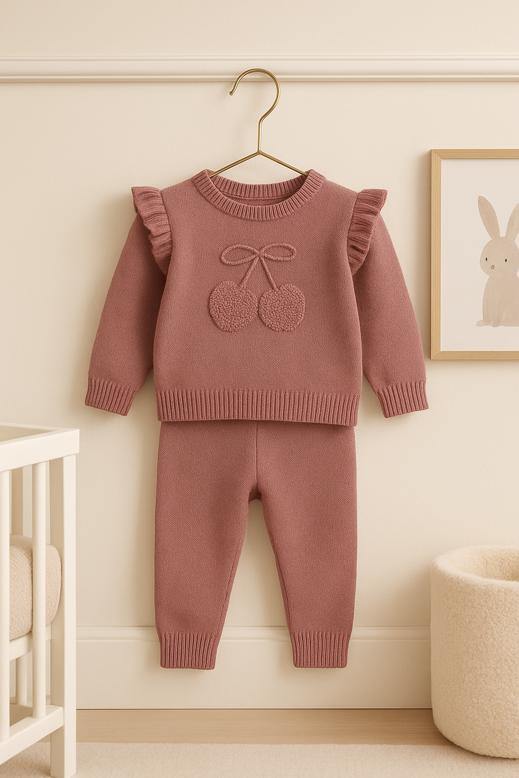 Die gestrickten Rüschendetails am Oberteil verleihen dem Anzug eine romantische Note, während die weiche, strukturierte, geprägte Kirschapplikation sowohl Niedlichkeit als auch ein hochwertiges Tragegefühl vermittelt.