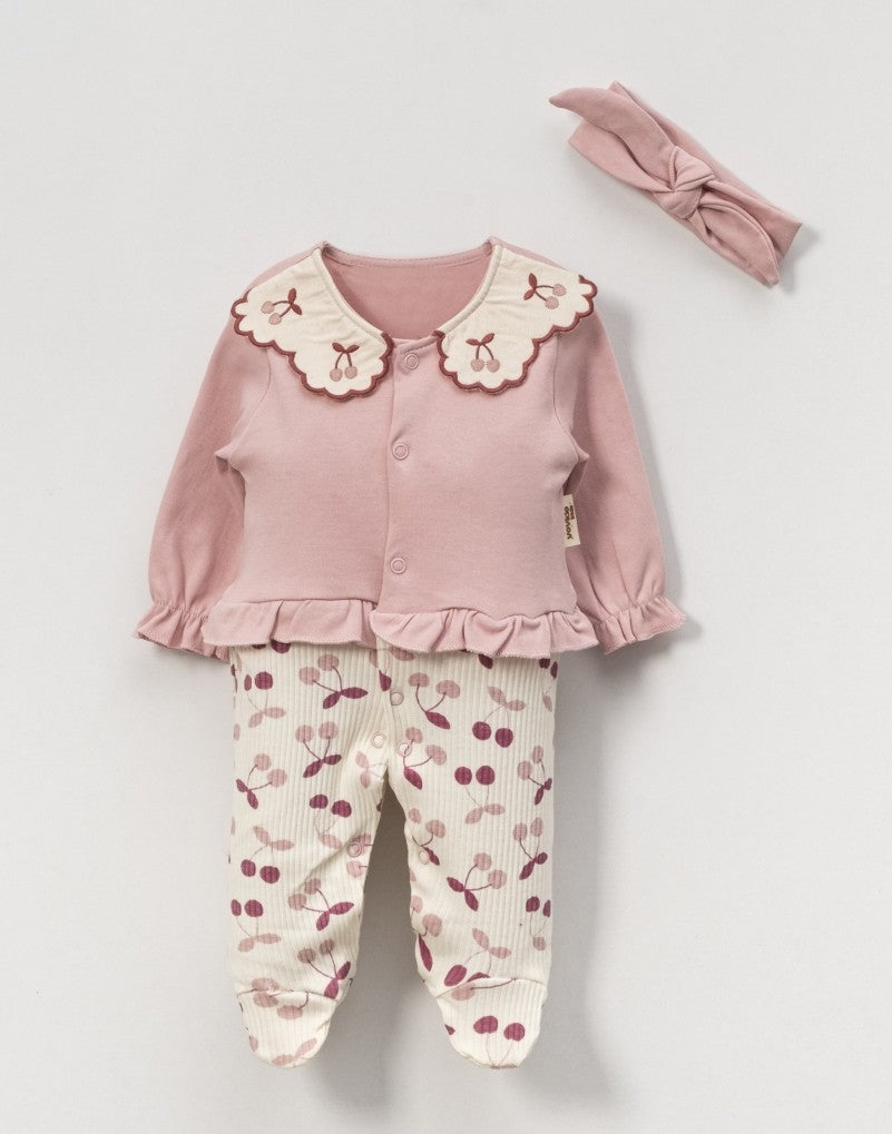 Cherry Blossom 3’lü Bebek Takım Seti, yumuşak pembe tonları ve zarif kiraz işlemeli yakasıyla bebeğinizin ilk günlerine romantik ve şirin bir hava katar. %100’e yakın doğal dokulu kumaşı hassas cilde nazik davranırken, esnek yapısı gün boyu rahat hareket imkânı sağlar.