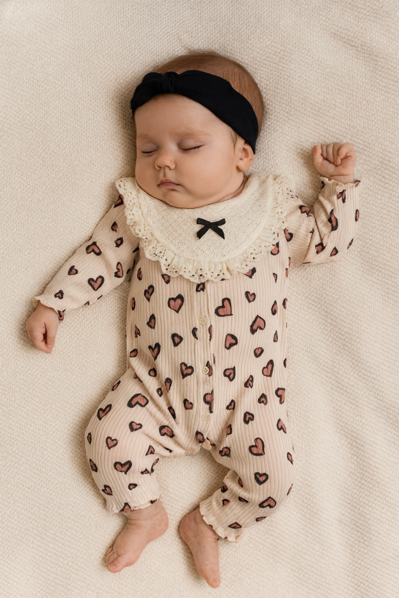 Lovely Hearts Dantel Yaka Bebek Tulum, yumuşacık kumaşı ve romantik kalp desenleriyle bebeğinizin ilk günlerine sıcak, tatlı ve fotojenik bir hava katar. Dantel işlemeli özel tasarım yakası ve minik fiyonk detayı, tuluma zarif bir şıklık kazandırırken, nefes alan doğal yapısı bebeğinizin hassas cildine gün boyu konfor sunar.