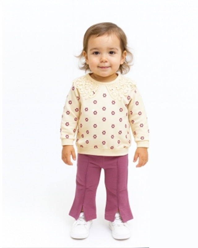 Krem tonlarındaki çiçek desenli sweatshirt, yakasındaki dantel detayıyla nostaljik bir zarafet katarken; ribanalı dokulu mor pantolonuyla hem rahat hem de modern bir görünüm sağlar.