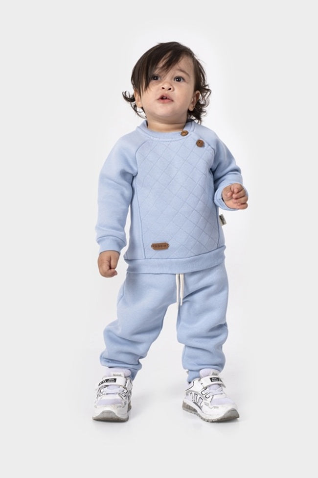 Yumuşacık dokusu ve sade tasarımıyla minik kalplere konfor sunan bu takım, günlük kullanım için idealdir. Kapitone desenli sweatshirt, omuz kısmındaki ahşap düğme detayıyla şıklık kazanırken; esnek bel yapısına sahip pantolon, bebeklerin rahat hareket etmesini sağlar.